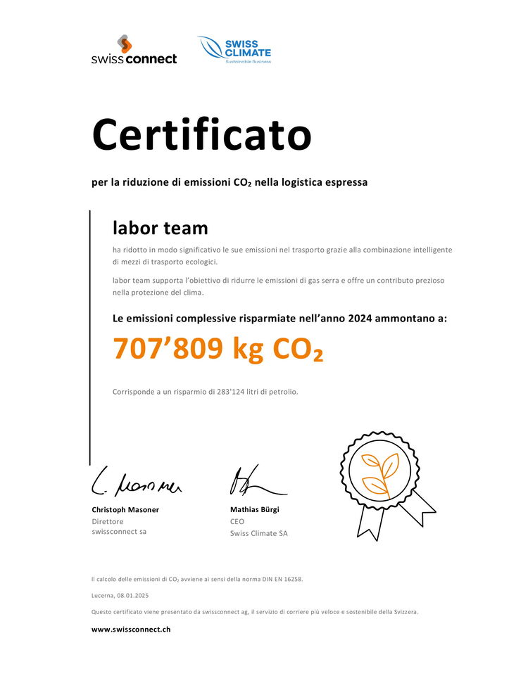 labor team è il primo laboratorio in Svizzera e il quarto in Europa a ottenere la certificazione «Green & Sustainable Laboratory» dalla Federazione Europea di Chimica Clinica e Medicina di Laboratorio (EFLM) e si impegna con perseveranza per una diagnostica sostenibile. Il fatto che da oltre due decenni i campioni di laboratorio arrivino nella Svizzera orientale in treno conferma che la sostenibilità è una componente fondamentale della cultura aziendale di labor team. Grazie a un software sofisticato, swissconnect coordina l'interazione tra i corrieri locali in bicicletta e la ferrovia e il suo personale qualificato garantisce che i campioni di laboratorio vengano consegnati in modo sicuro e puntuale. Nel 2024, labor team ha risparmiato oltre 700.000 kg di CO2 perché i campioni non sono stati consegnati utilizzando l’auto, ma in treno. Se si tenesse conto anche del bilancio positivo di CO2 dei corrieri in bicicletta, il risparmio sarebbe ancora più consistente. In questo modo, labor team sottolinea in modo impressionante che la responsabilità ecologica e l'eccellenza medica possono andare di pari passo e lancia un segnale forte per un futuro sostenibile della medicina di laboratorio.